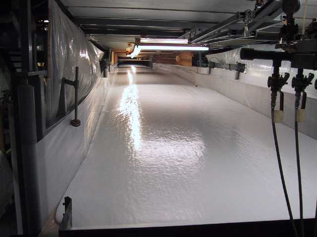 Le mélange des polymères, du catalyseur et de l'eau, sont d'abord émulsionnés et étendus en une épaisse couche sur un tapis roulant.